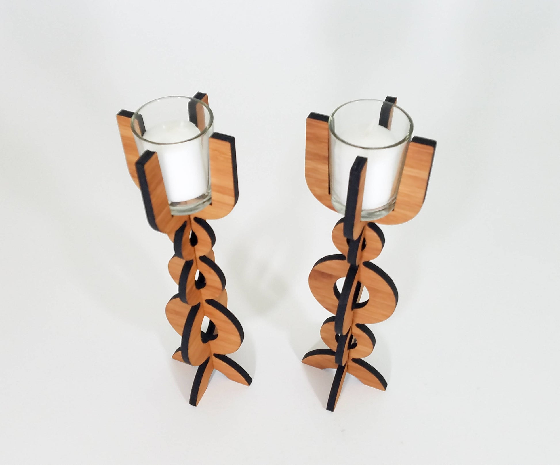 Bubble votive candlestick holder in bamboo. The individual pieces of this candle holder are easily taken apart and stored flat when not in use. Holds one votive candle and includes glass votive cup. Bamboo with linseed oil finish. Price is for one candlestick. Tall: 3" x 3" x 10.75"