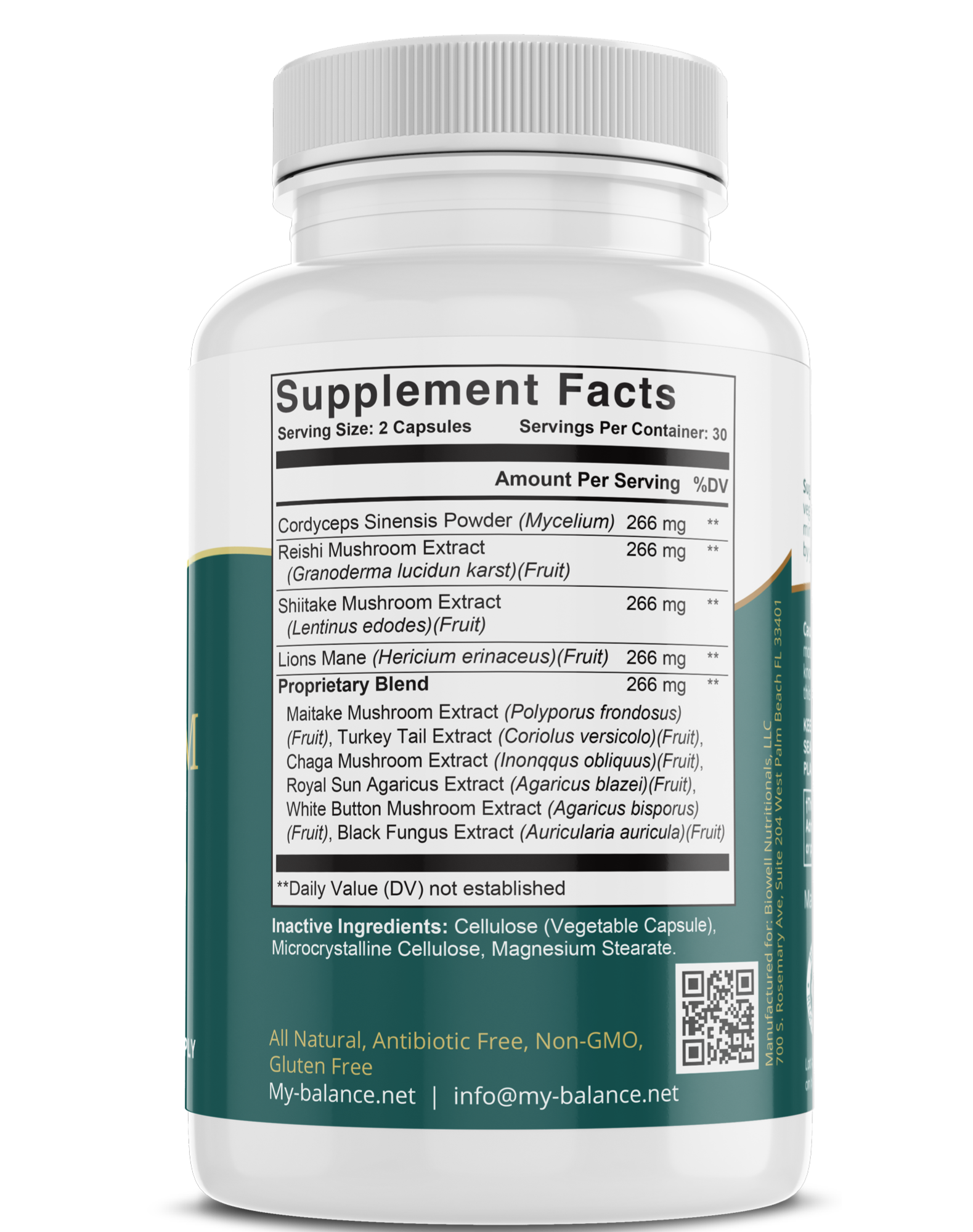 Diverse Mushroom Blend – Features 10 mushrooms including Chaga, Cordyceps, Reishi, Lion’s Mane, Maitake, Turkey Tail, and more.